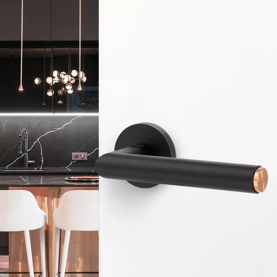 Manerul LUCIA SELECT este disponibil cu tehnica clip on sau insurubare, fabricat din otel inoxidabil, negru grafit si negru grafit cu accente de alama sau cupru. Negrul „nostru” este un negru mat, foarte profund si cu toate acestea, nu este sensibil la amprentele digitale. Manerul circular PLANEO GM_49111, cu incrustatii din alama sau cupru, se potriveste liniei de design formand un contrast minunat cu marginea neagra.